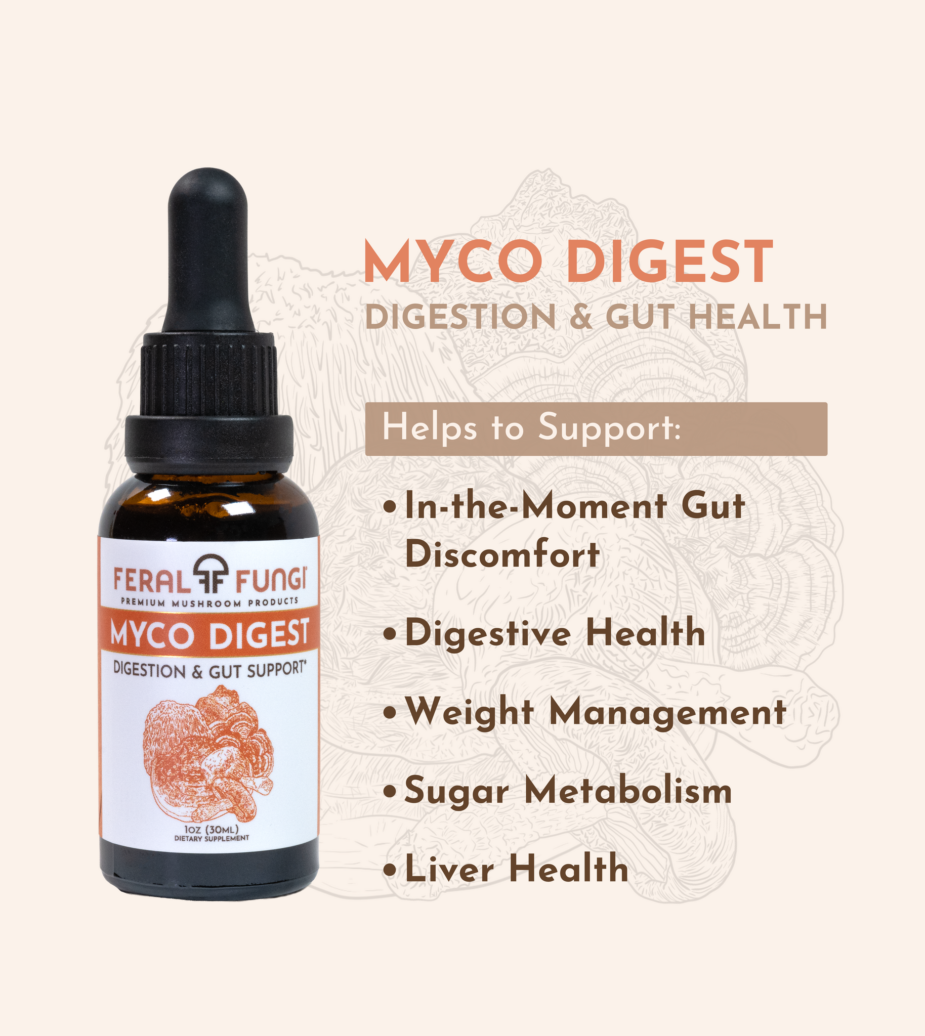 Our Myco-Digest blend is designed to support digestive health and gut function with a blend of Lion's Mane, Red Belted Conk, Chaga, Shiitake, and Turkey Tail mushrooms.