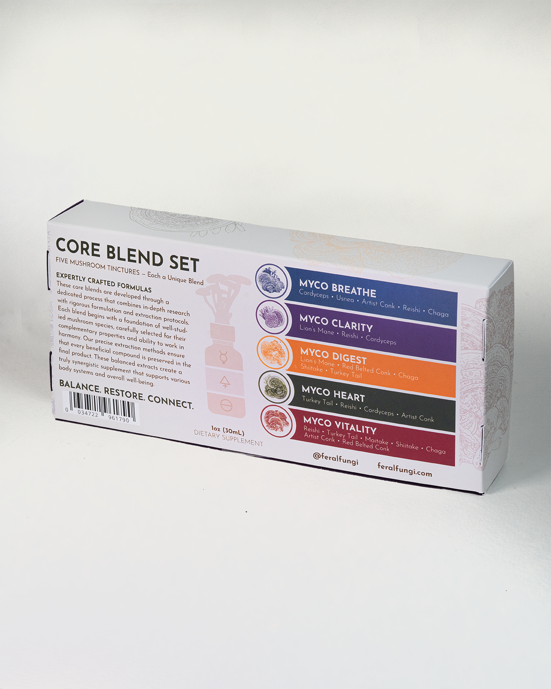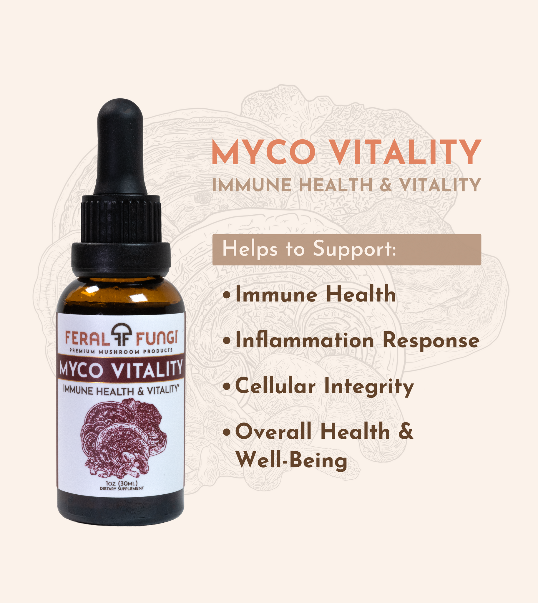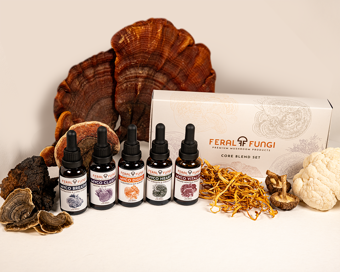 Our Myco-Vitality blend is designed to support overall health and vitality with a blend of Reishi, Turkey Tail, Maitake, Shiitake, Chaga, Artist Conk, and Red Belted Conk mushrooms.
